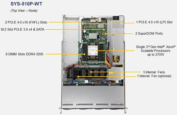 The Supermicro UP SuperServer SYS-510P-WT | SYS-510P-WT supports the Intel Intel Xeon Scalable Processors 3rd Generation family in a high-density 1U form-factor. These SuperServers are ideal for network infrastructure, front-end enterprise, and minimal-downtime cluster server systems.