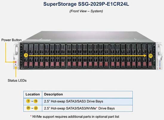 The Supermicro SuperStorage 2029P-E1CR24L | SSG-2029P-E1CR24L can be configured with 2.5" drives, a more space efficient and low noise option. These drives also offer energy savings and increased flexibility.