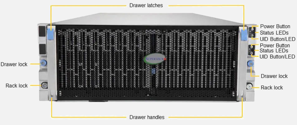 The Supermicro Storage SuperServer 640SP-DE2CR90 | SSG-640SP-DE2CR90 features hot-swap hard drives, giving you more flexibility and allowing you to remove drives without having to shut down the system.