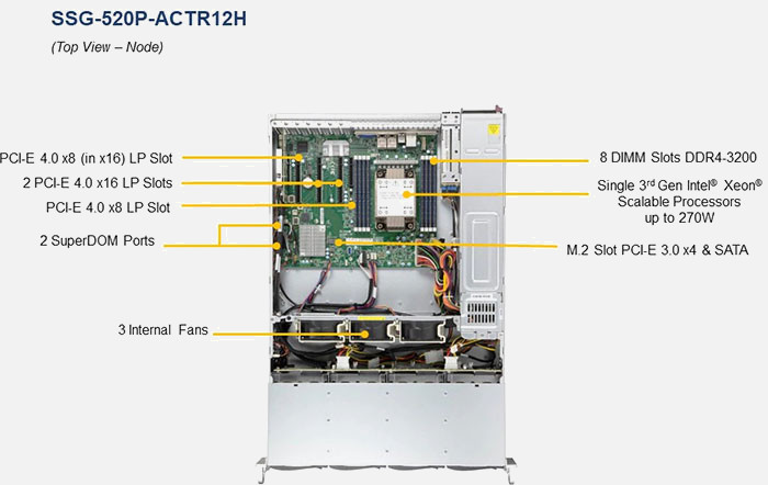 The Supermicro UP Storage SuperServer SSG-520P-ACTR12H | SSG-520P-ACTR12H supports the Intel Intel Xeon Scalable Processors 3rd Generation family in a high-density 2U form-factor. These SuperServers are ideal for network infrastructure, front-end enterprise, and minimal-downtime cluster server systems.
