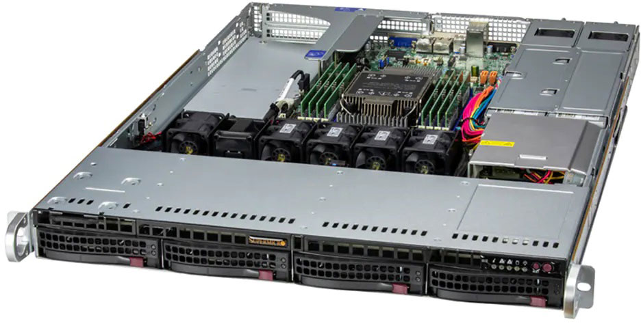 Supports 1x double slot GPU card, 5th/4th Gen Intel Xeon Scalable processor, dual 1Gb/s LAN ports, redundant power supply, 4x 3.5" NVMe/SATA hot-swappable bays